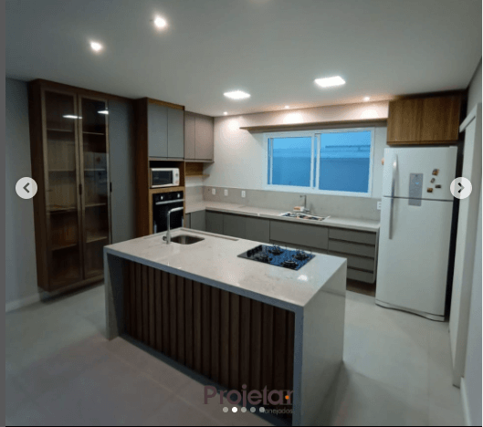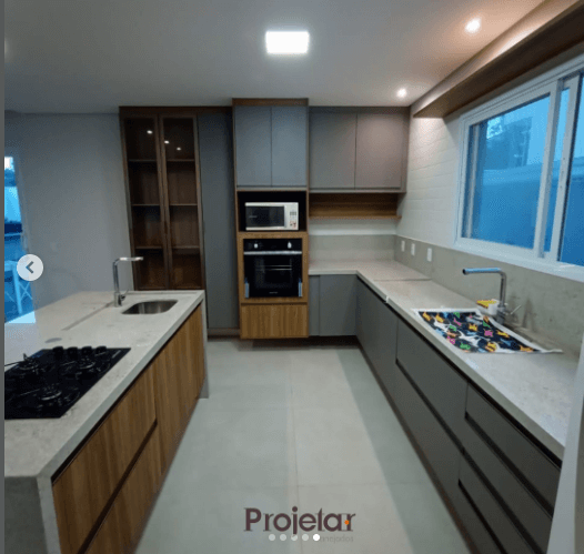 Para essa cozinha super espaçosa foram escolhidas as cores Ópera Vel (cinza) e o amadeirado Louro Freijó.